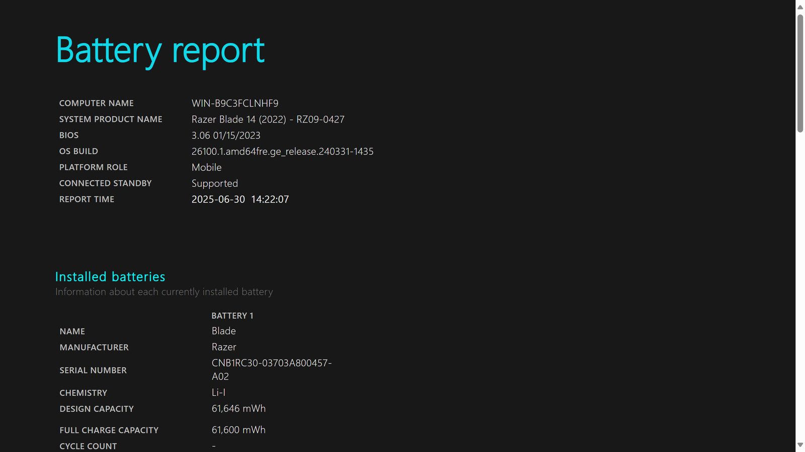 Battery Condition: 61,384/61,646 mWh 99.57%