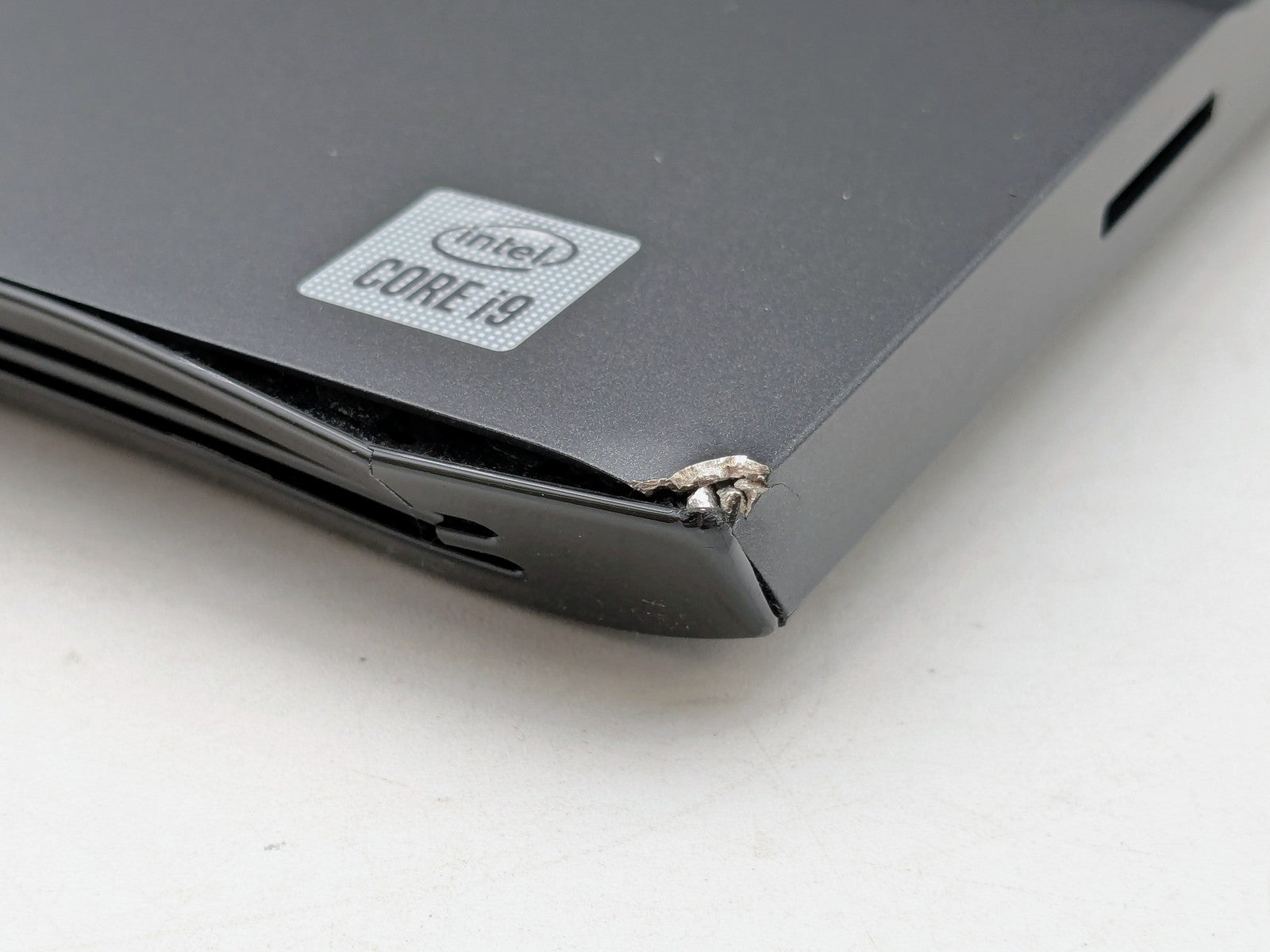 Cosmetic Defects: Interior: Marks on display, invisible during normal use. Moderate wear on keyboard and display bezel, light wear on palm rest and touchpad. Palm rest cracked on right corner, inside exposed, Exterior: Heavy wear and scratches on lid and hinge, moderate wear on bottom cover, cracked on corner. Scuffed along edges of device.