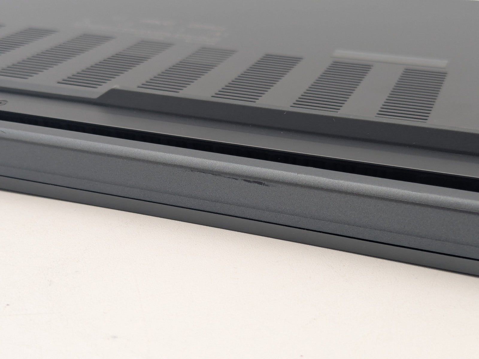 Cosmetic Defects: Interior: In excellent condition. Exterior: Top cover has minor scratches and visible dent. Hinge cover has moderate scuff. Bottom cover has minor edge and rubber foot wear.