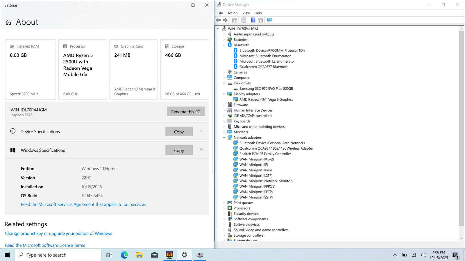 DELL Inspiron 5575 15" FHD Touch RYZEN 5 2500U 512GB 8GB W10 Vega 8 GFX Backlit