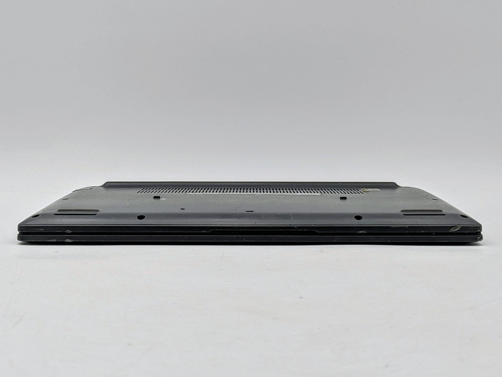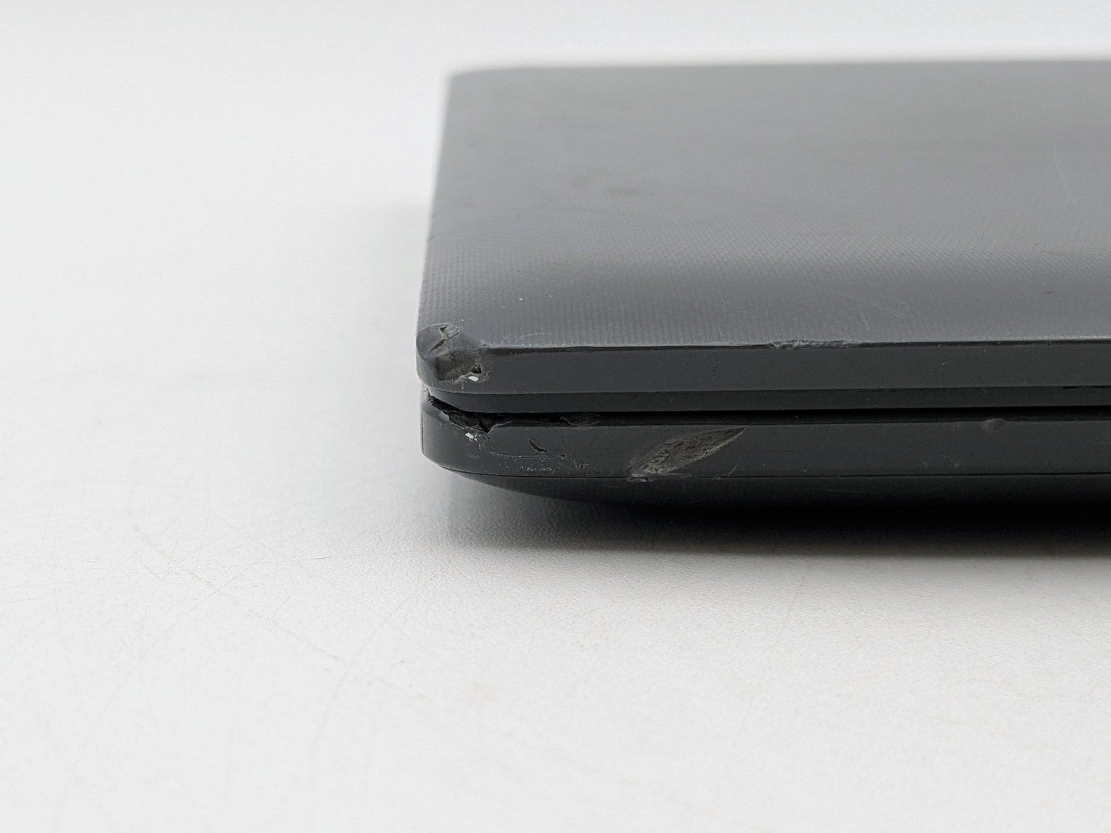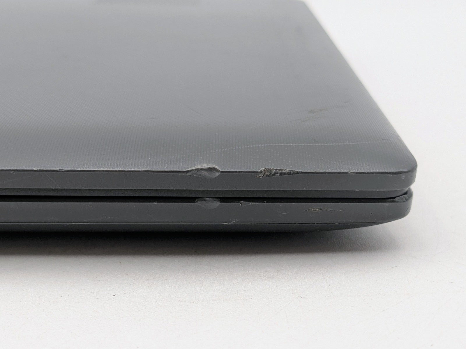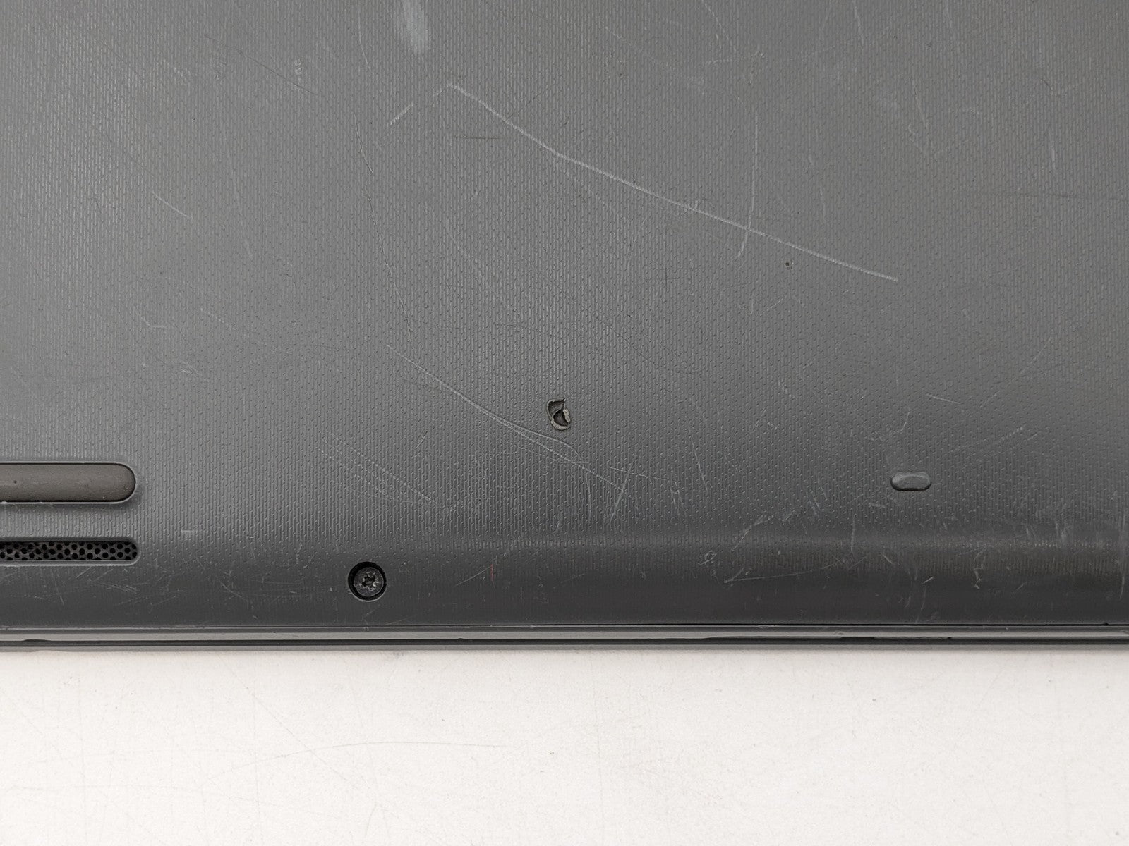 Cosmetic Defects: Interior: Display has visible scratches and keyboard imprinting. Heavy wear on keyboard, palm rest, touchpad, above keyboard, and on bezel. Exterior: Heavy wear and scratches on all exterior surfaces, scuffed/chipped along edges. Discoloration on rubber feet, patch of melted plastic on bottom cover.