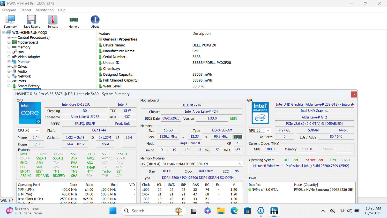 Dell Latitude 5430 14" FHD I5-1235U 256GB SSD 16GB W11P Webcam Backlit IRCam