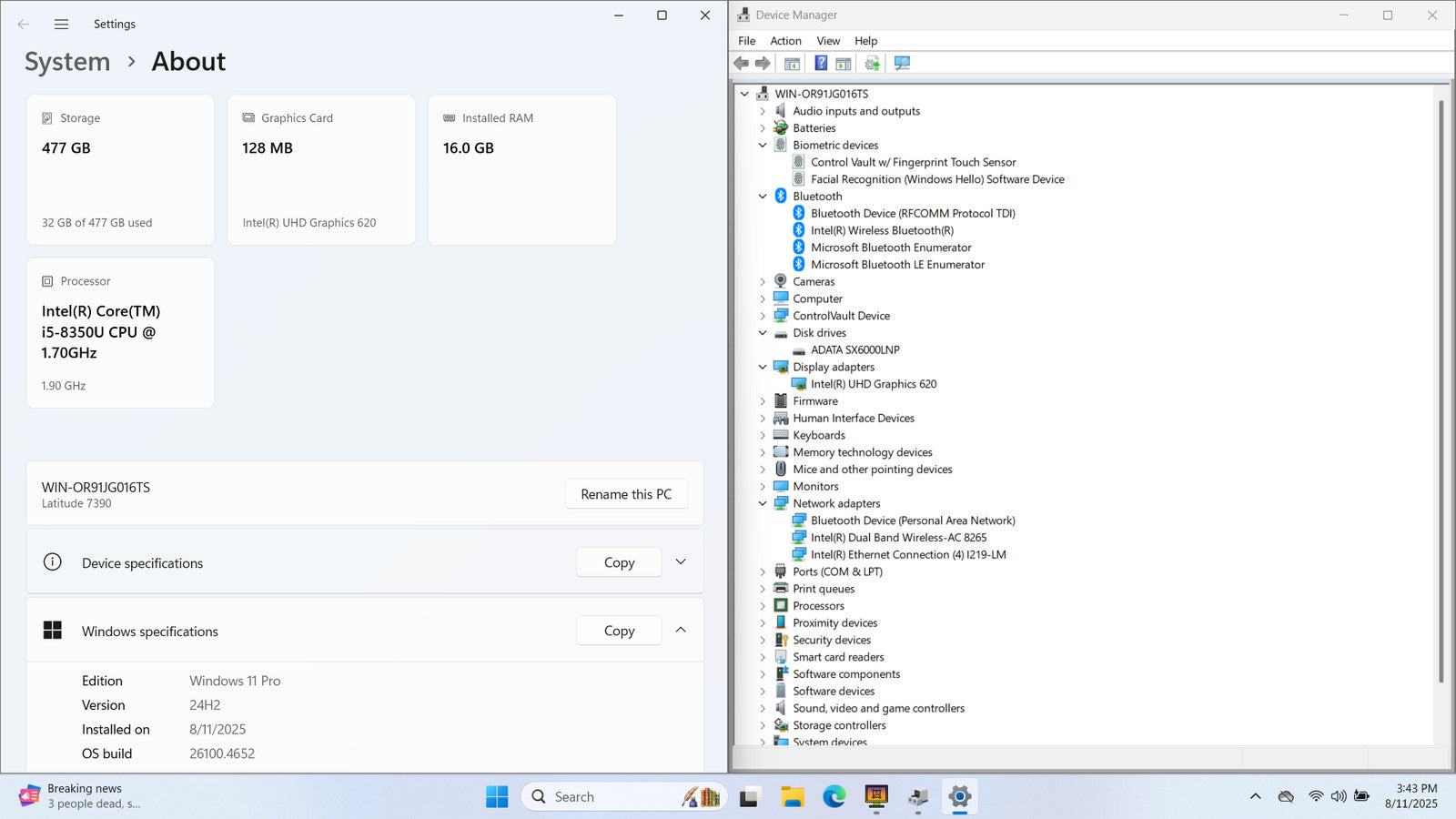 Dell Latitude 7390 13" FHD Touch I5-8350U 512GB 16GB W11P Backlit FPR IRCam