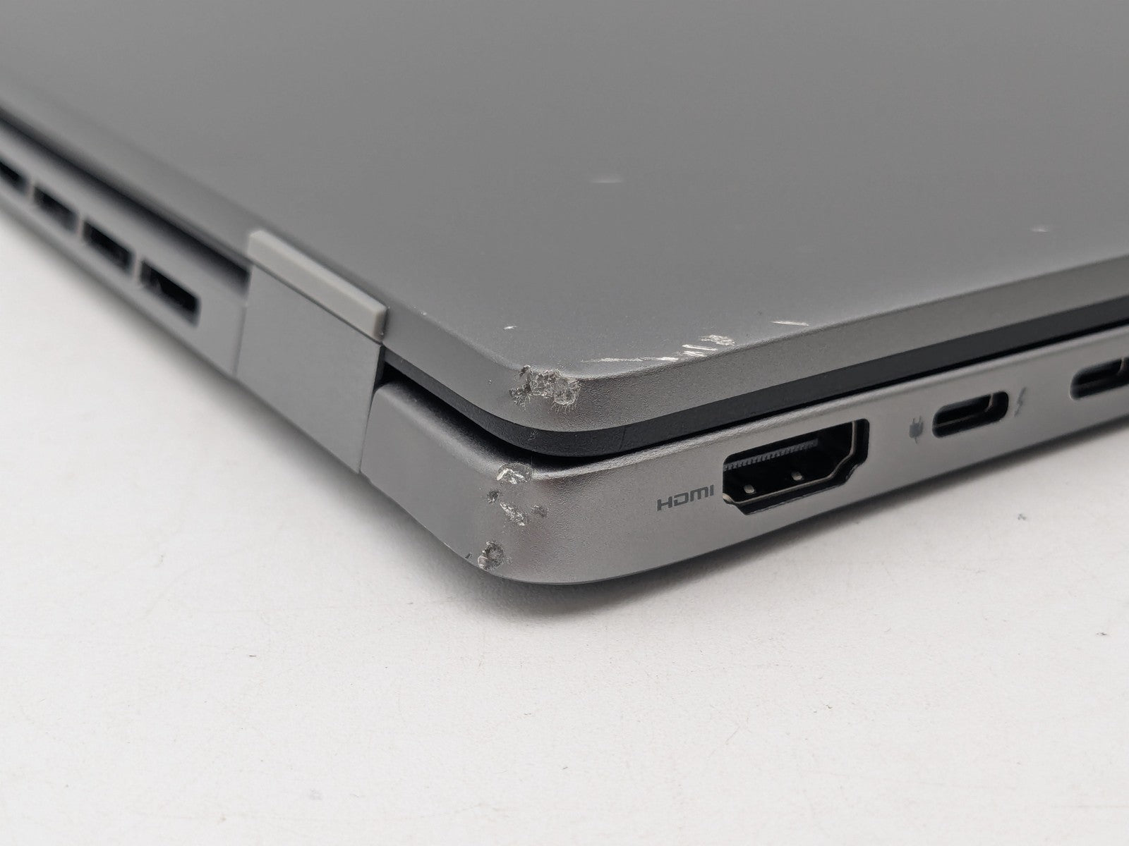 Cosmetic Defects: Interior: Display has visible scratches and keyboard imprinting. Scuffs on top bezel near camera. Exterior: Deep scuffs, scratches, and dents on edges and top cover. One rear corner is slightly bent, causing bottom cover to not sit flush.