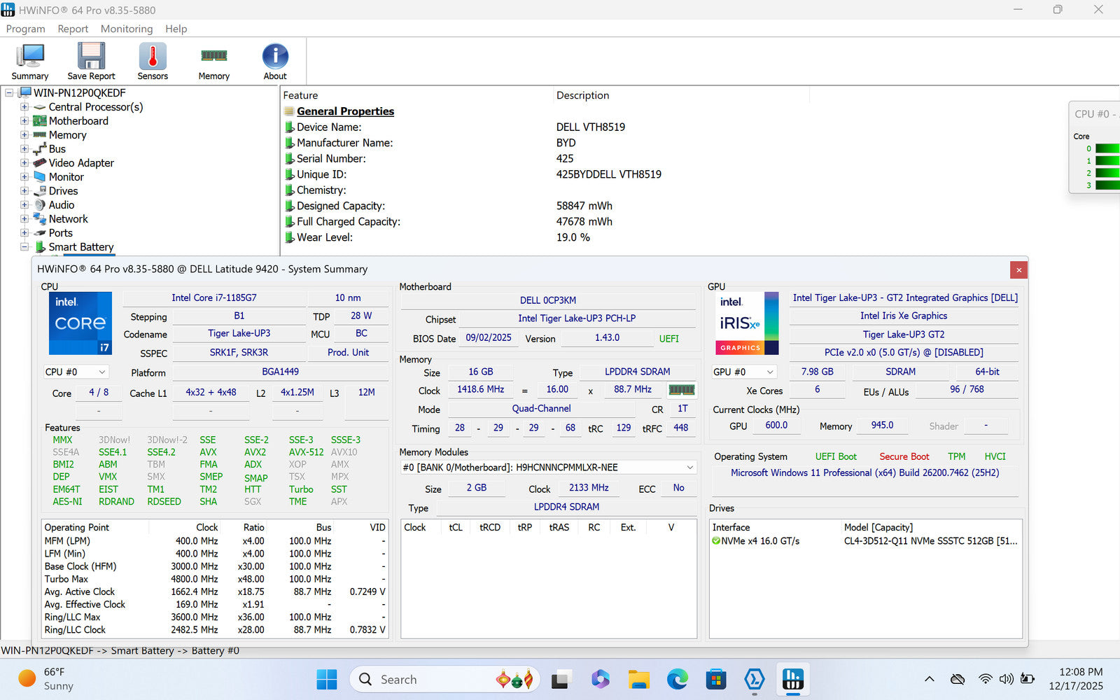 Dell Latitude 9420 14" 2560 x 1600 Touch I7-1185G7 512GB SSD 16GB W11P *READ*