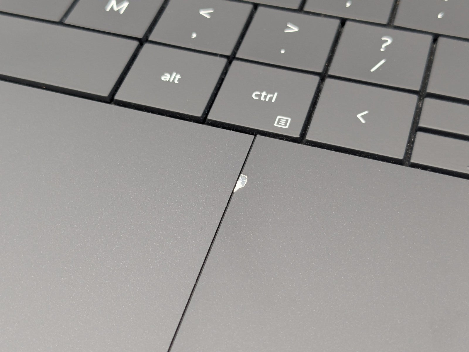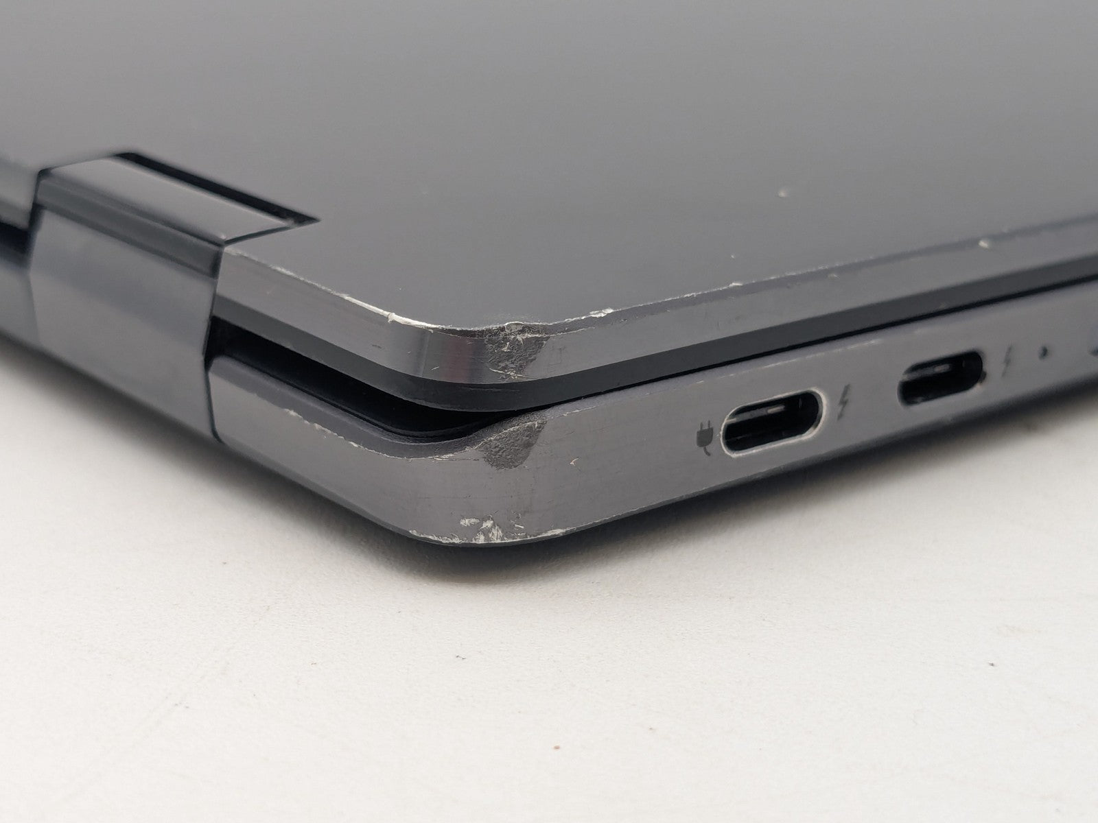 Cosmetic Defects: Interior: Display has small visible marks. Palmrest has visible scratches, scuffs, and a chip near the touchpad. Touchpad and keycaps have minor wear. Exterior: Both covers have visible scratches and scuffs. Top cover has small dents. Bottom cover has discoloration, small crack, and small color marks.