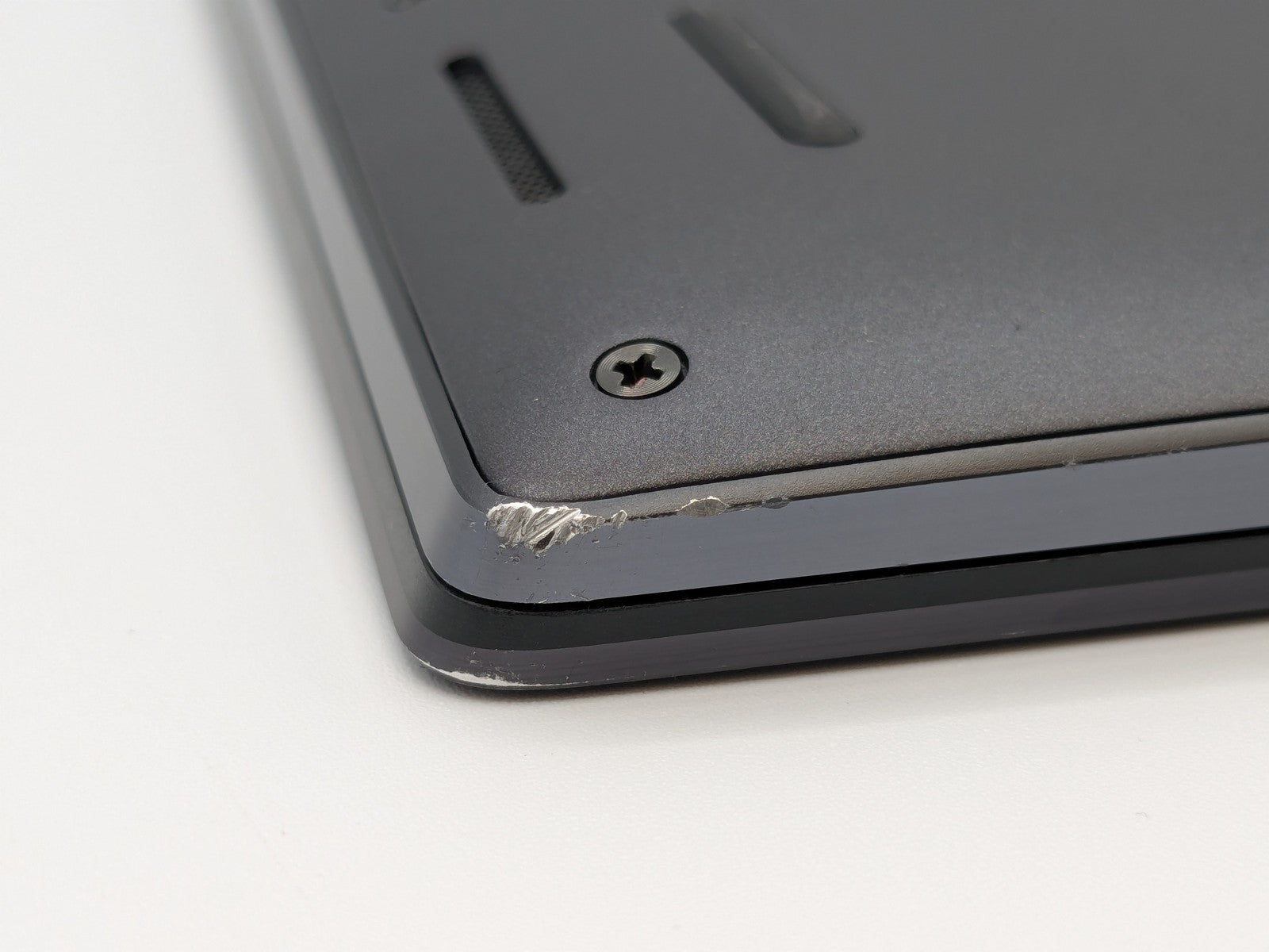 Cosmetic Defects: Interior: Display has visible scratches and keyboard imprinting. Moderate wear on keyboard, bezel, and above keyboard. Light wear on touchpad and palm rest. Exterior: Moderate wear and scratches on lid and bottom cover, scuffed/chipped along edges of device. Marks on hinges.