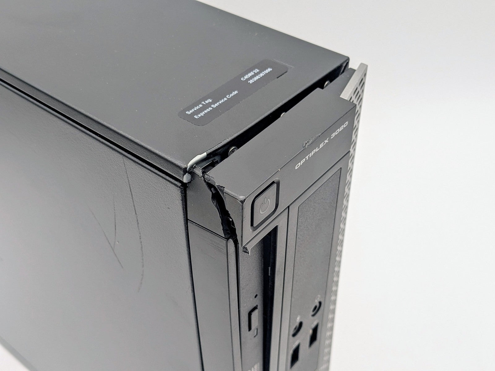 Cosmetic Defects: Front panel has several cracks, missing some clips. Case is warped, causing gaps in side and front panels, as well as a slight wobble when set vertically. Several large scuffs across device, small dents.
