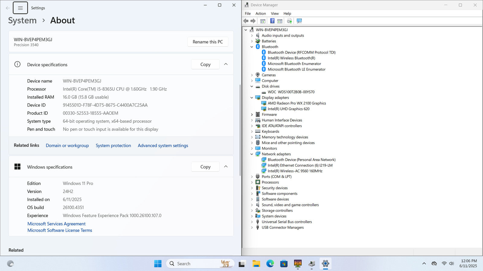 Dell Precision 3540 15" FHD I5-8365U 1TB 16GB W11P Radeon Pro WX 2100 Backlit