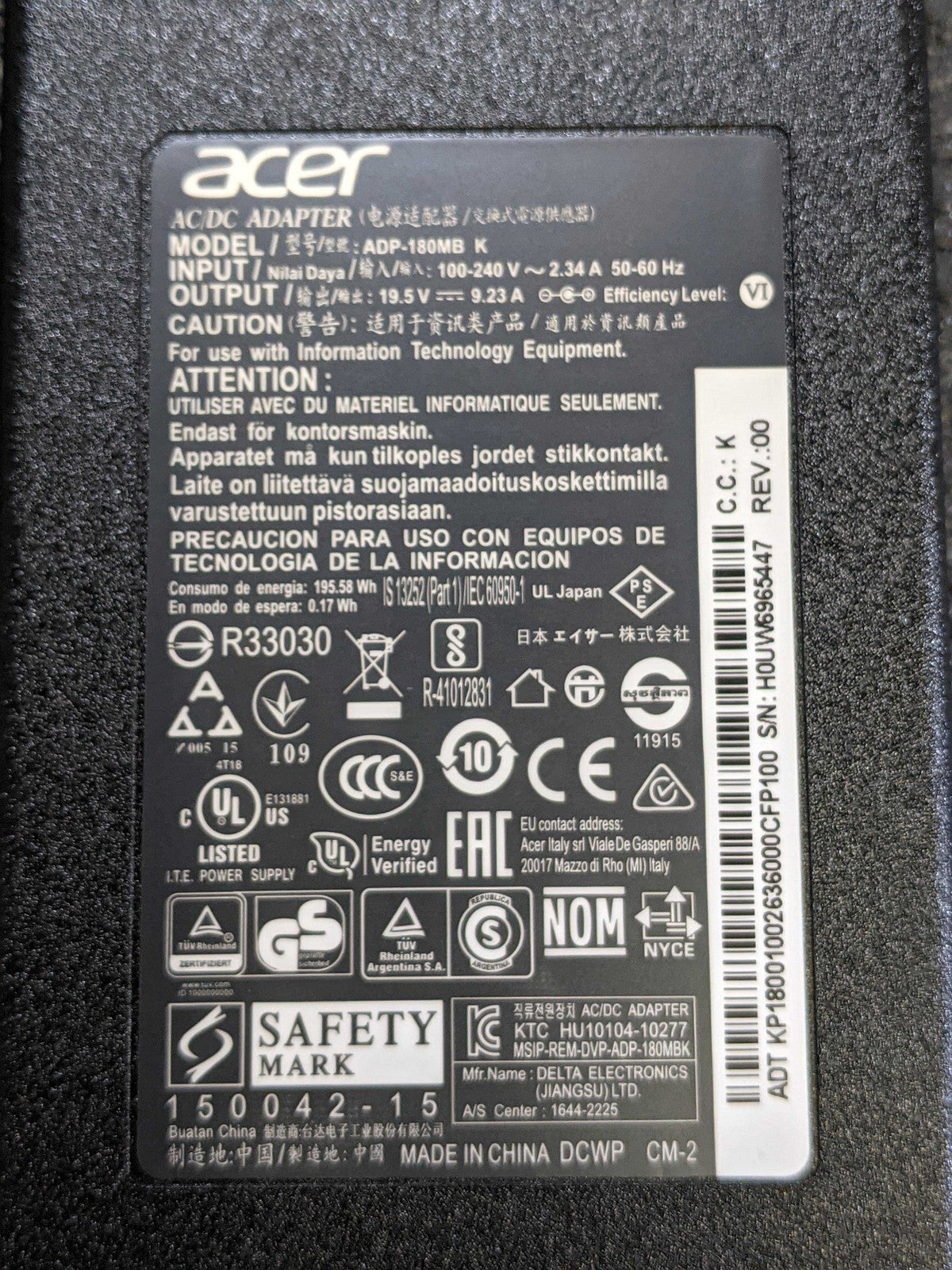 DELTA Acer Purple Tip 180W 19.5V 9.23A AC Adapter Charger ADP-180MB K MSI GS63