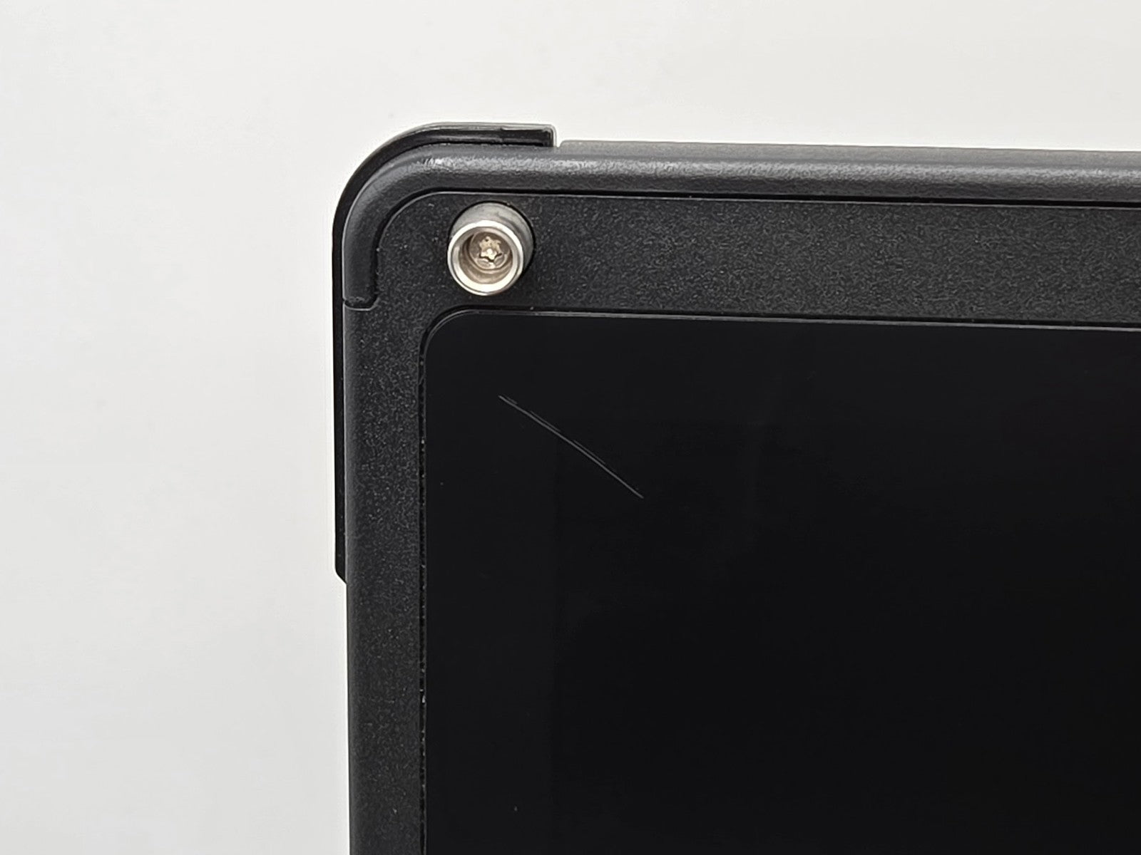 Cosmetic Defects: Interior: Scratch on display, visible during normal use. Moderate wear, patches of discoloration on keyboard, palmrest, and touchpad. Exterior: Heavy scuffing on bottom cover, handle, and rubber bumpers. Scratches, small dings across all surfaces of device.
