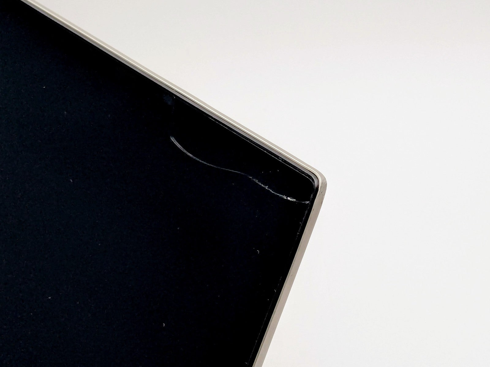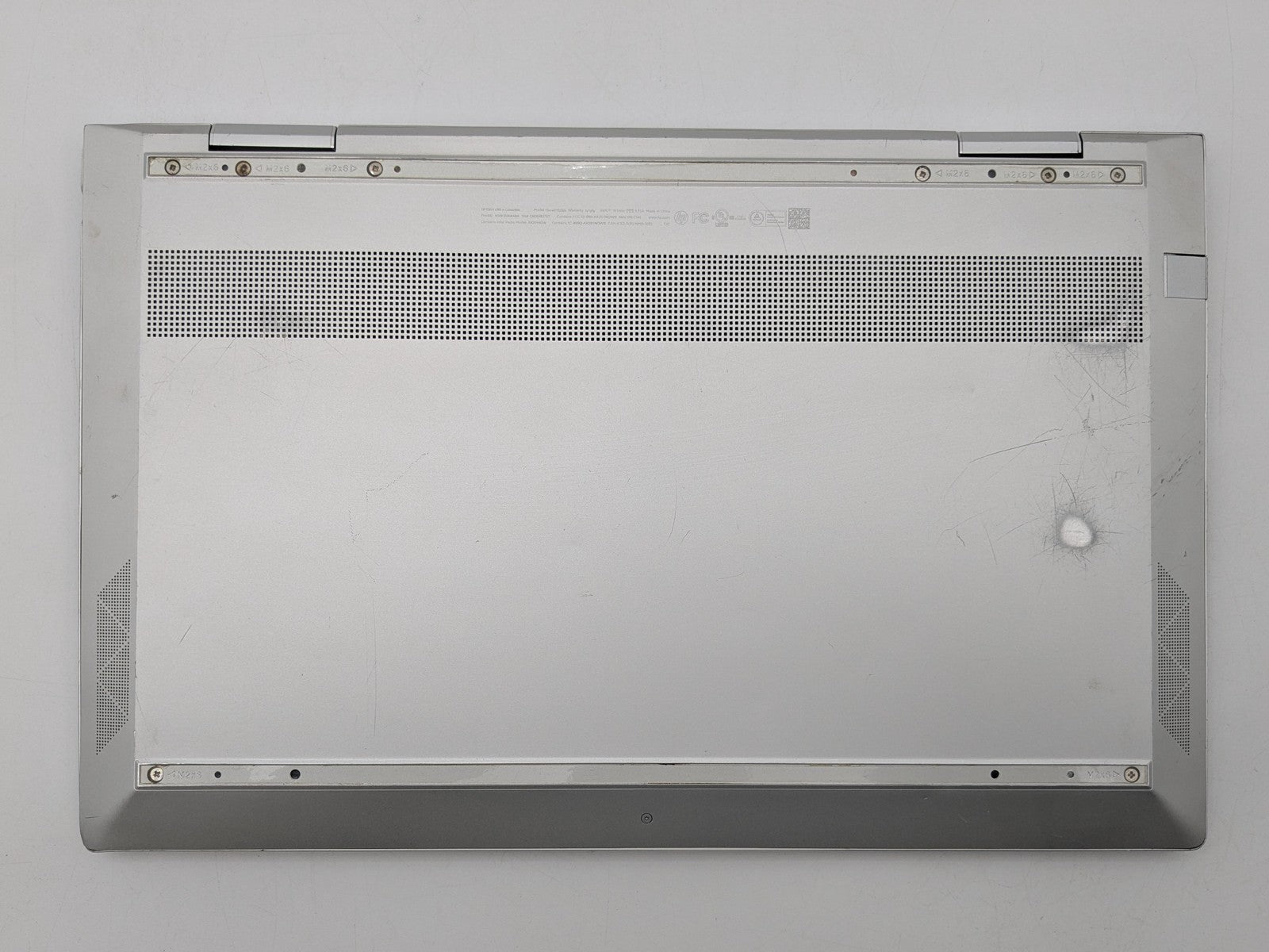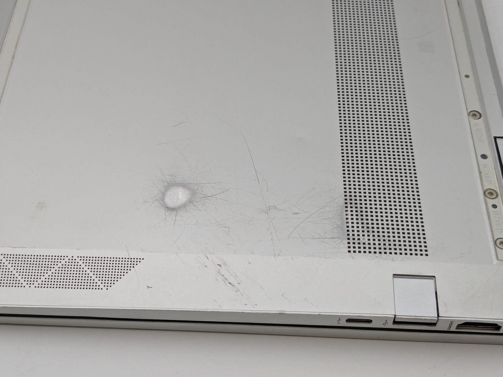 Cosmetic Defects: Interior: Display has visible scratches and keyboard imprinting, large crack on top right corner. Visible wear and scratches on keyboard, palm rest, and hinges. Exterior: Visible wear and scratches on lid and bottom cover. Missing bottom rubber feet. Dented on corner, cover does not fully close. Dents and scratches around edges of device, USB port dented but still operates.