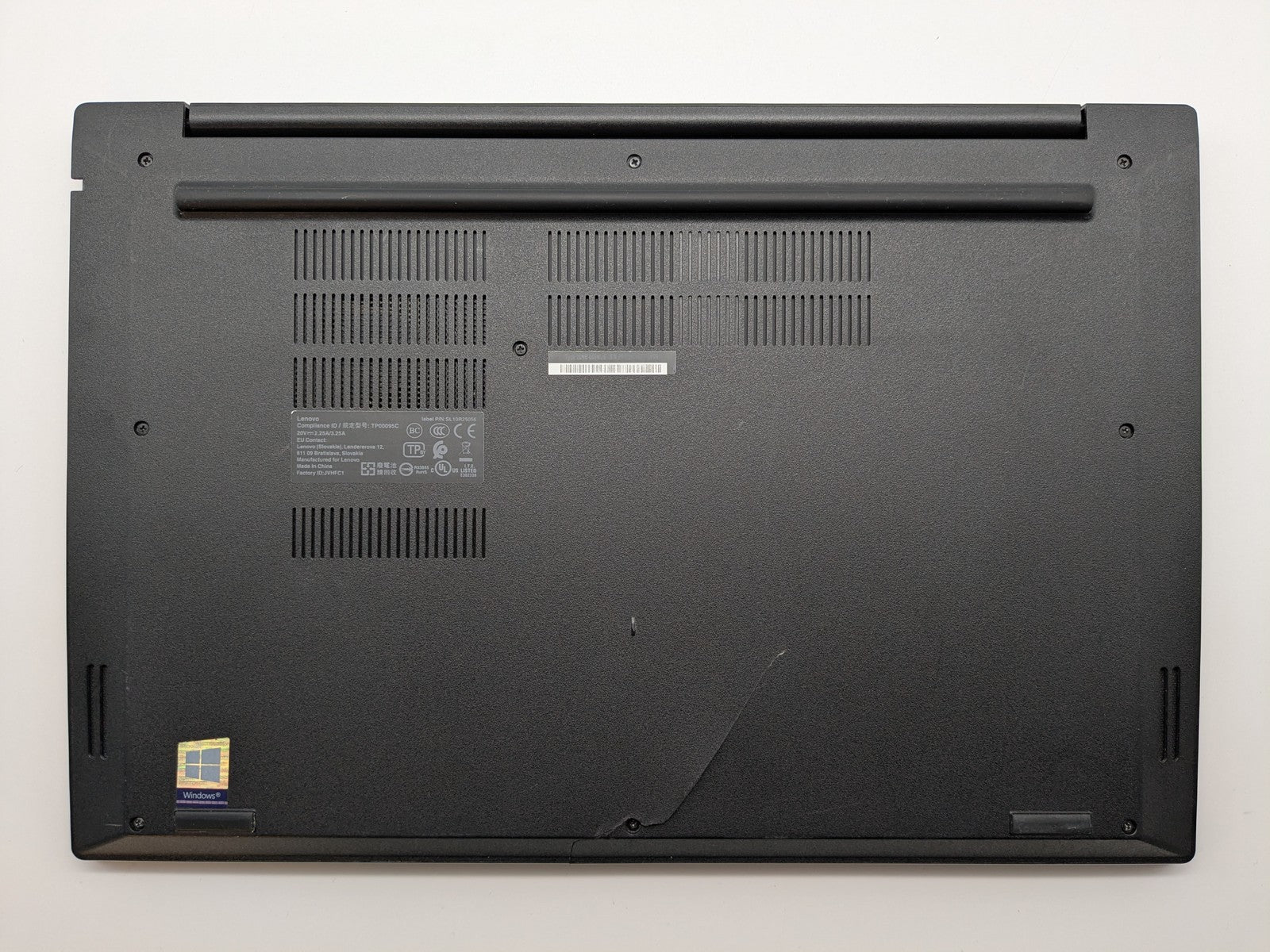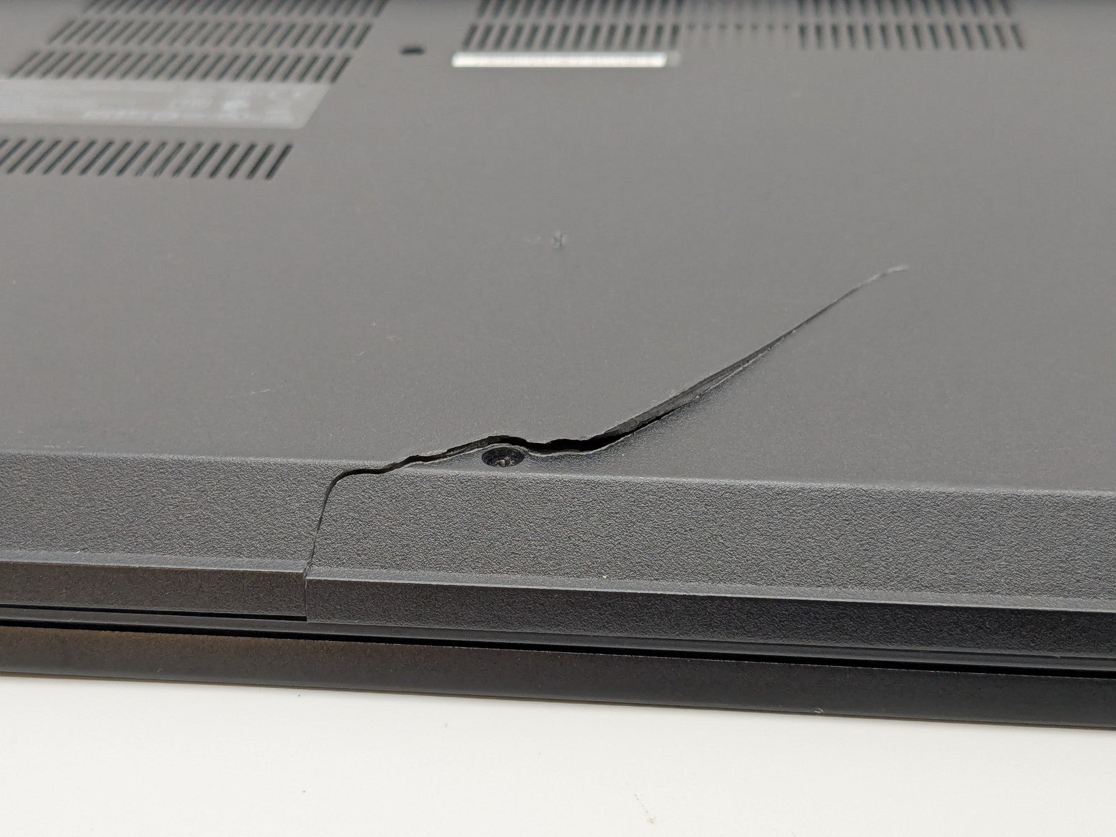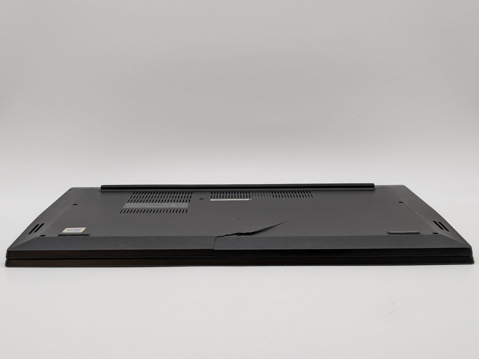 Cosmetic Defects: Interior: Heavy wear on keyboard, palmrest, and keycaps Display has visible scratches and keyboard imprinting. Crack and scuffs on bezel. Exterior: Scuffs, chips, and paint scratch on top cover. Large crack in bottom cover, prohibits bottom cover fully closing.