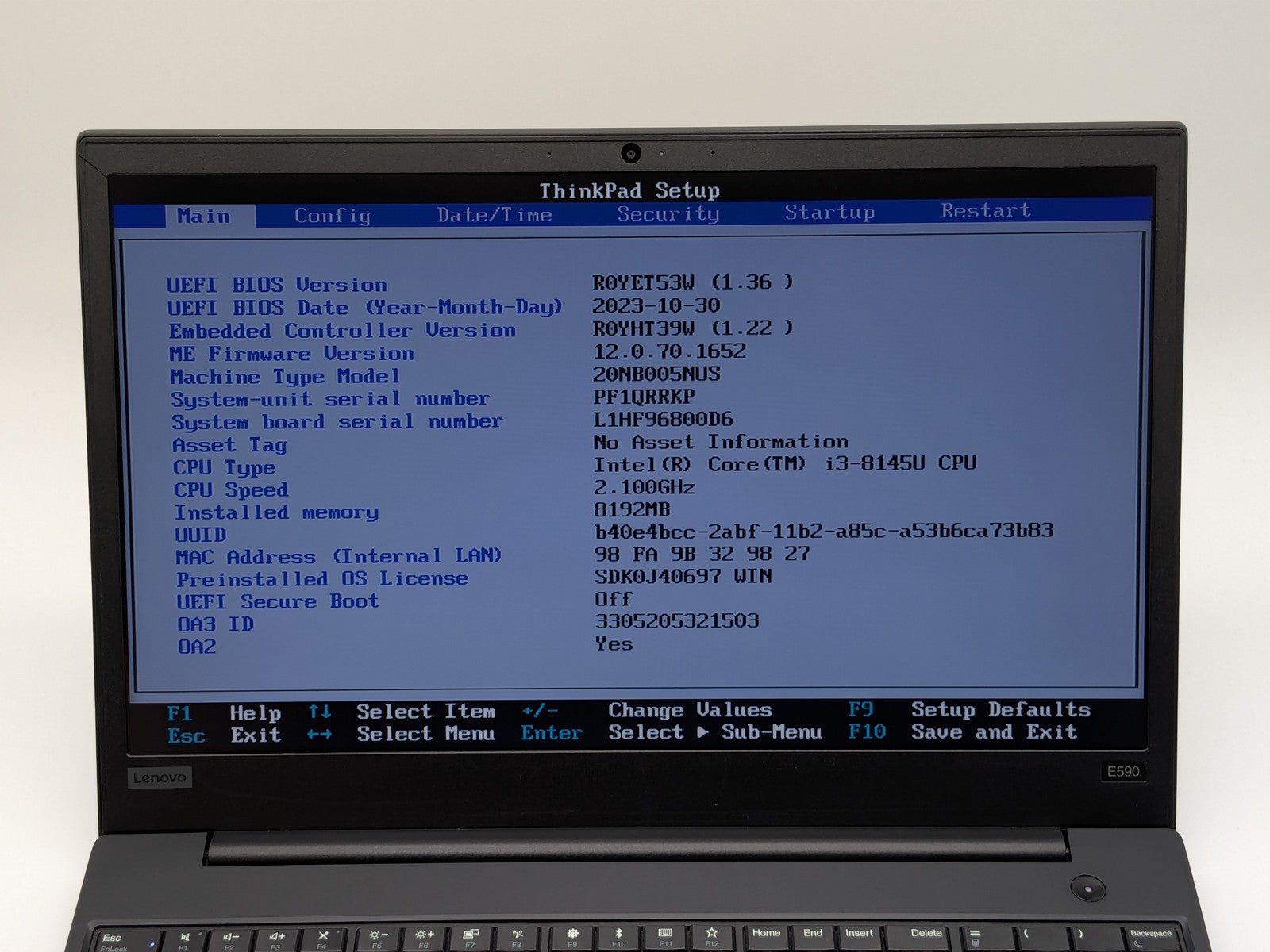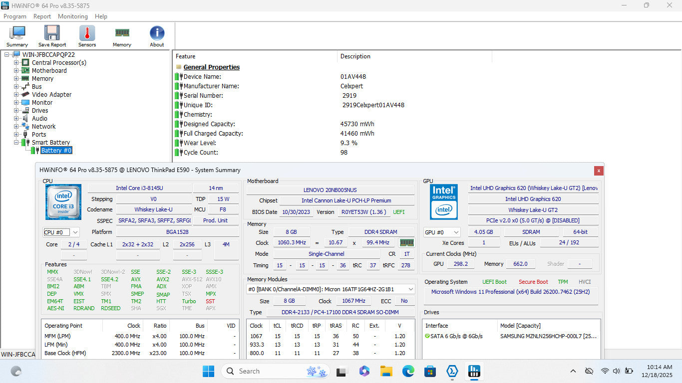 Lenovo ThinkPad E590 15" HD I3-8145U 256GB SSD 8GB W11P Webcam Ships Free