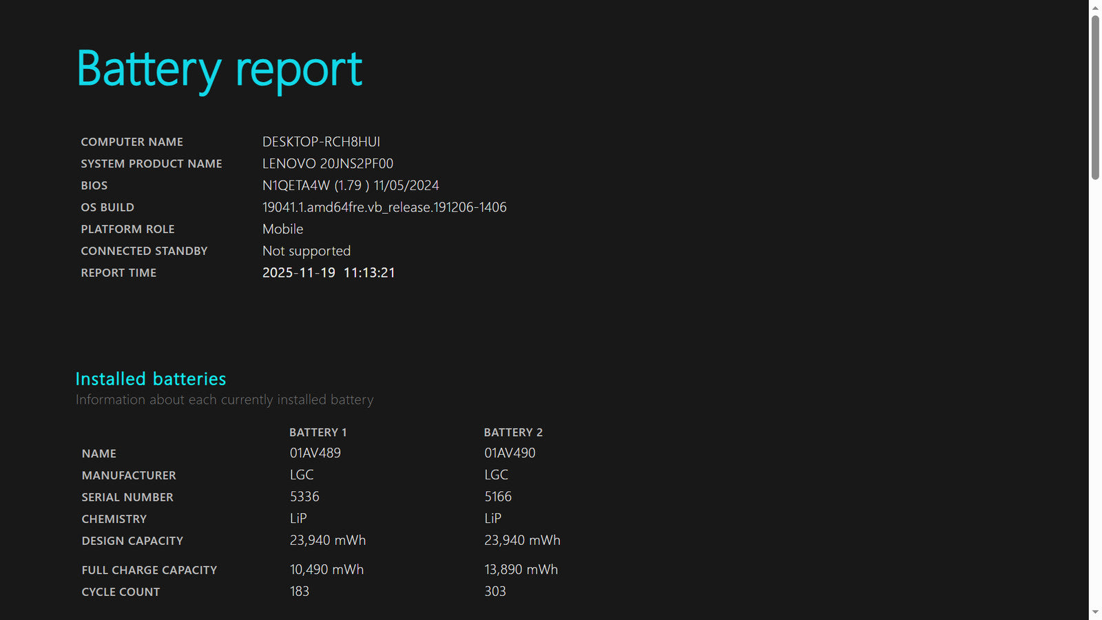Battery Condition: Battery 1: 10,490/23,940mWh 43.82% | Battery 2: 13,890/23,940mWh 58.02%