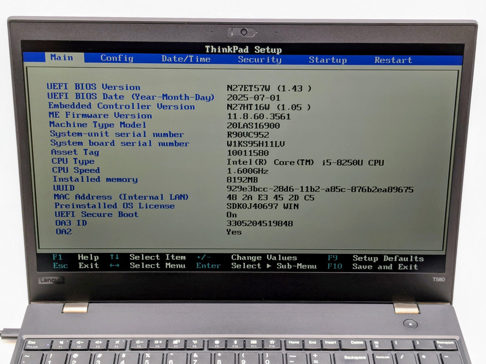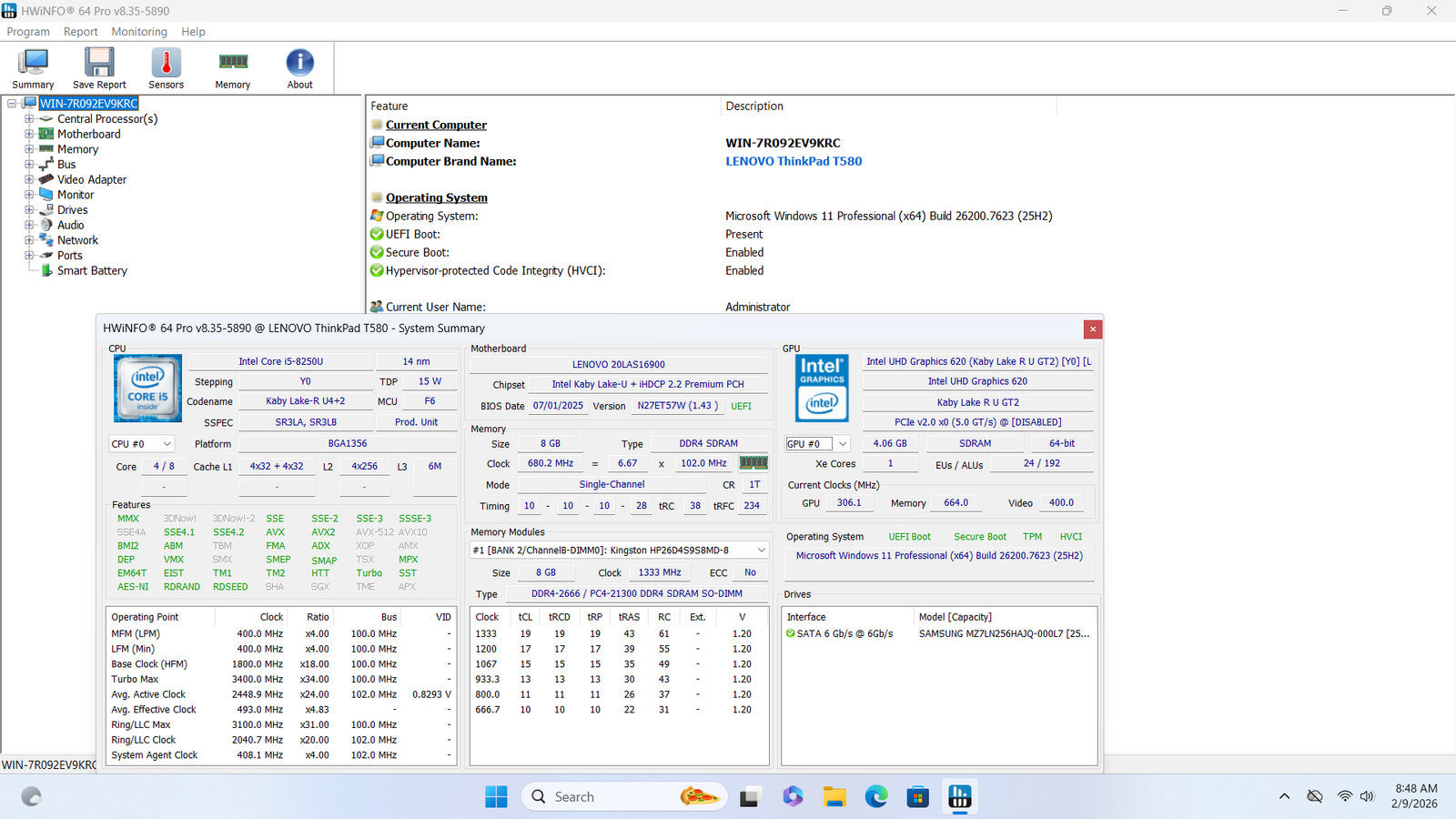 Lenovo ThinkPad T580 15" FHD I5-8250U 256GB SSD 8GB Webcam W11P *READ*