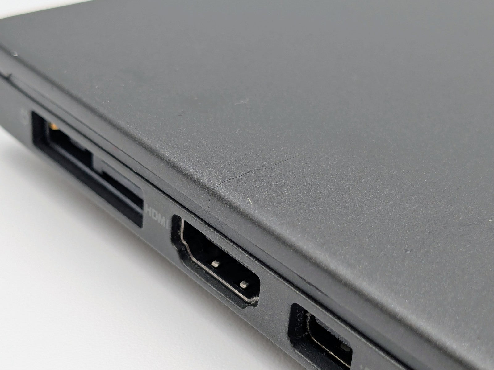Cosmetic Defects: Interior: Display has several light spots, heavy keyboard imprinting. Moderate wear on palmrest, touchpad, and keyboard. Exterior: Scuffs and many scratches on top and bottom of unit. Scratching and crack on sides of unit. Missing one rubber foot on bottom cover.