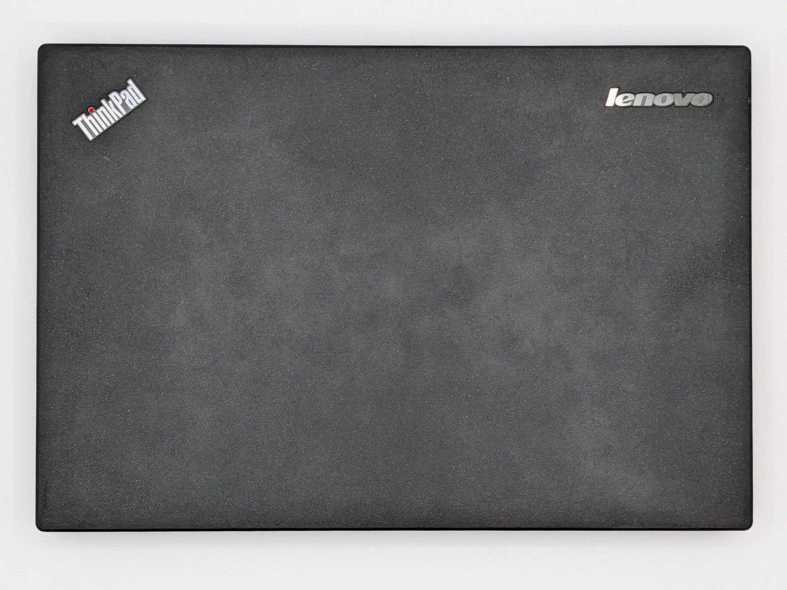 Cosmetic Defects: Interior: Display has visible scratches and keyboard imprinting. Heavy wear on keyboard, moderate wear on palm rest, bezel, and touchpad. Exterior: Moderate wear and scratches on lid, heavy wear/discoloration patches and moderate scratches on bottom cover. Scuffed along edges of device.