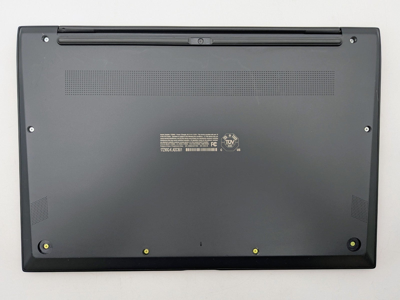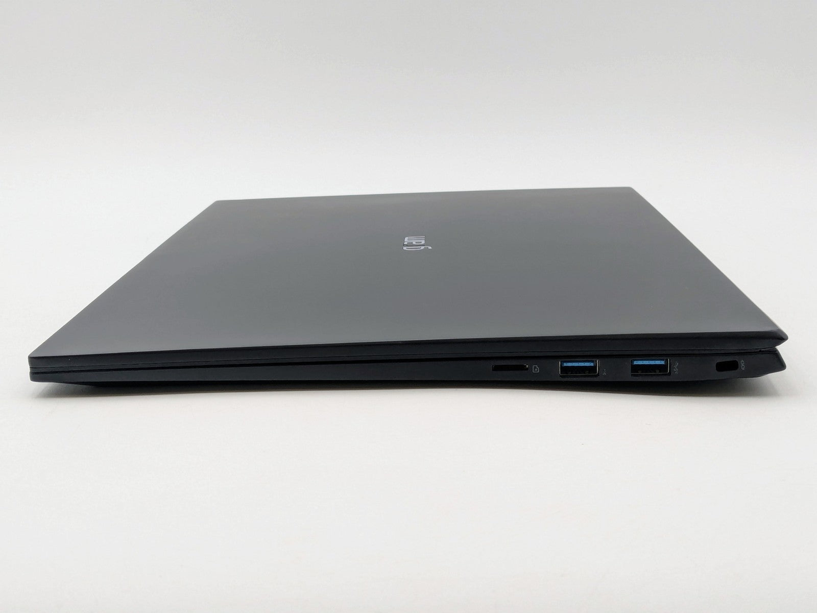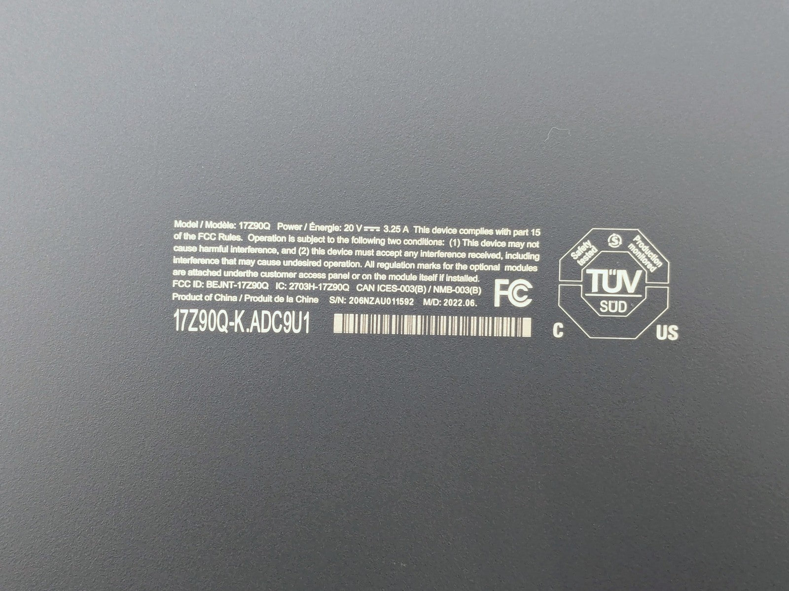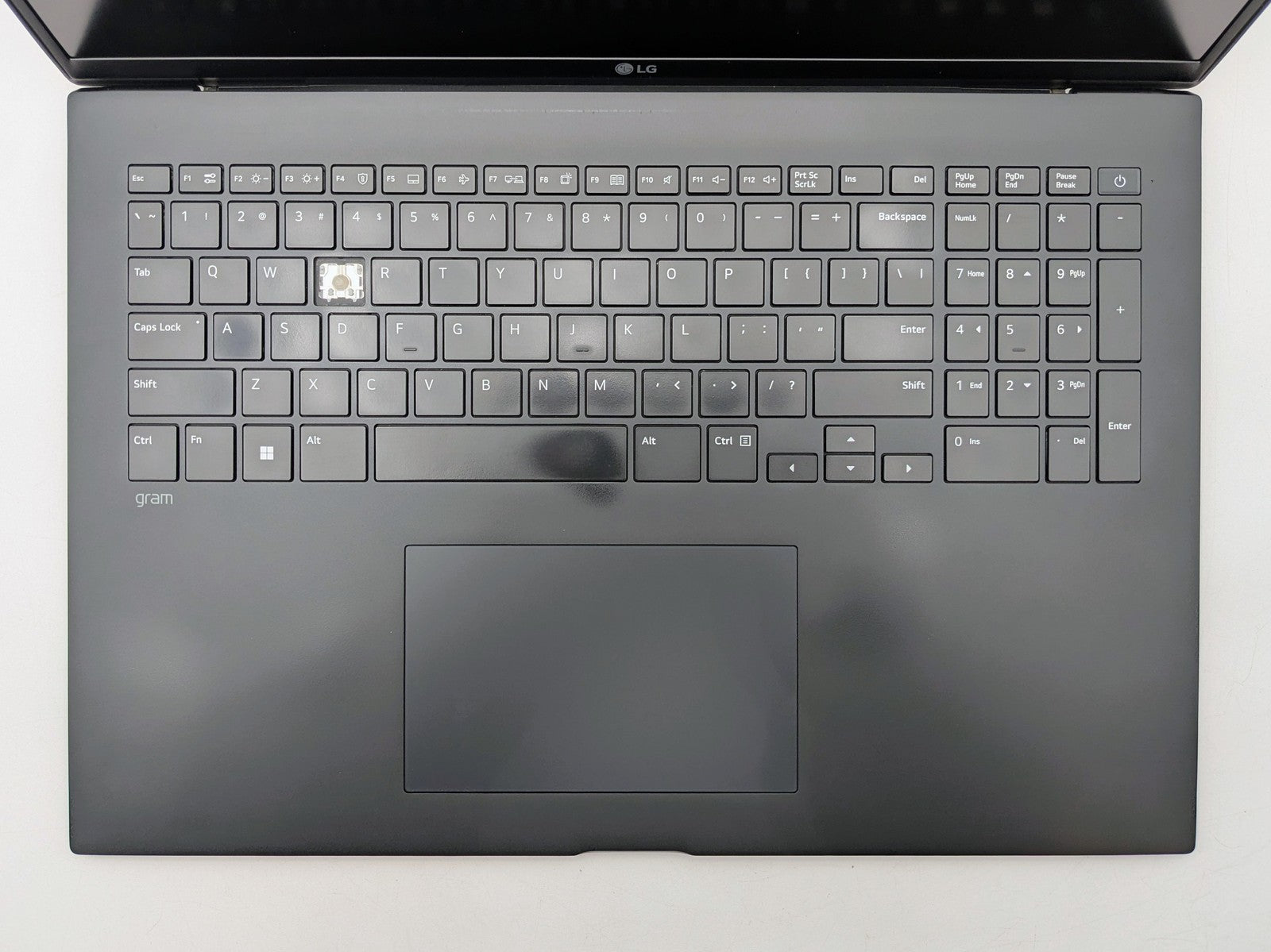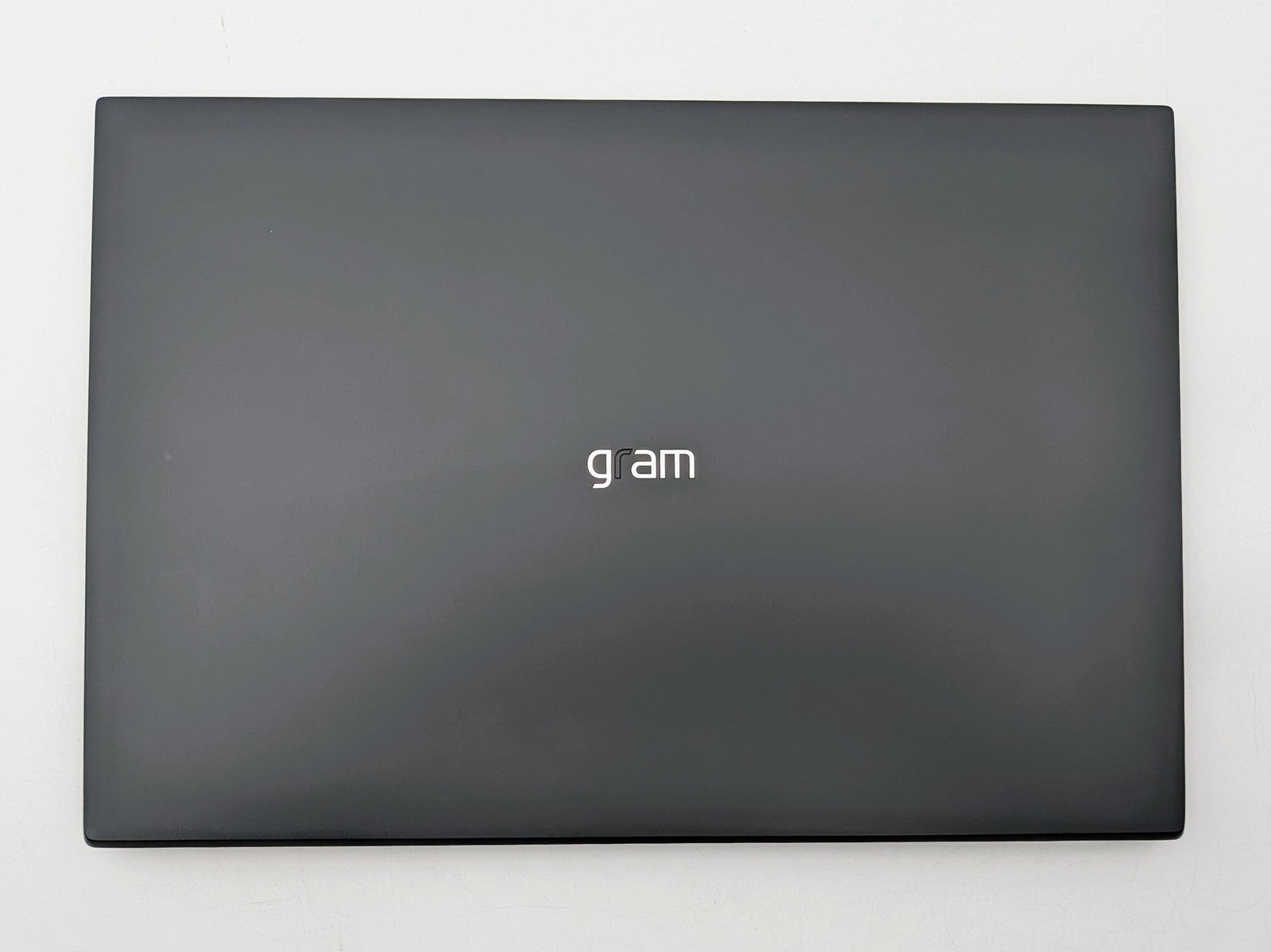Cosmetic Defects: Interior: Display has scratches and keyboard imprinting. Heavy wear on keyboard, palm rest, touchpad, bezel, and around keyboard. Small screw bubble above keyboard. Missing "E" key. Exterior: Visible wear and light scratches on lid, "gram" logo damaged. Visible wear and scratches on bottom cover. Missing bottom rubber feet and screw covers. Wear/scratches along edges of device.