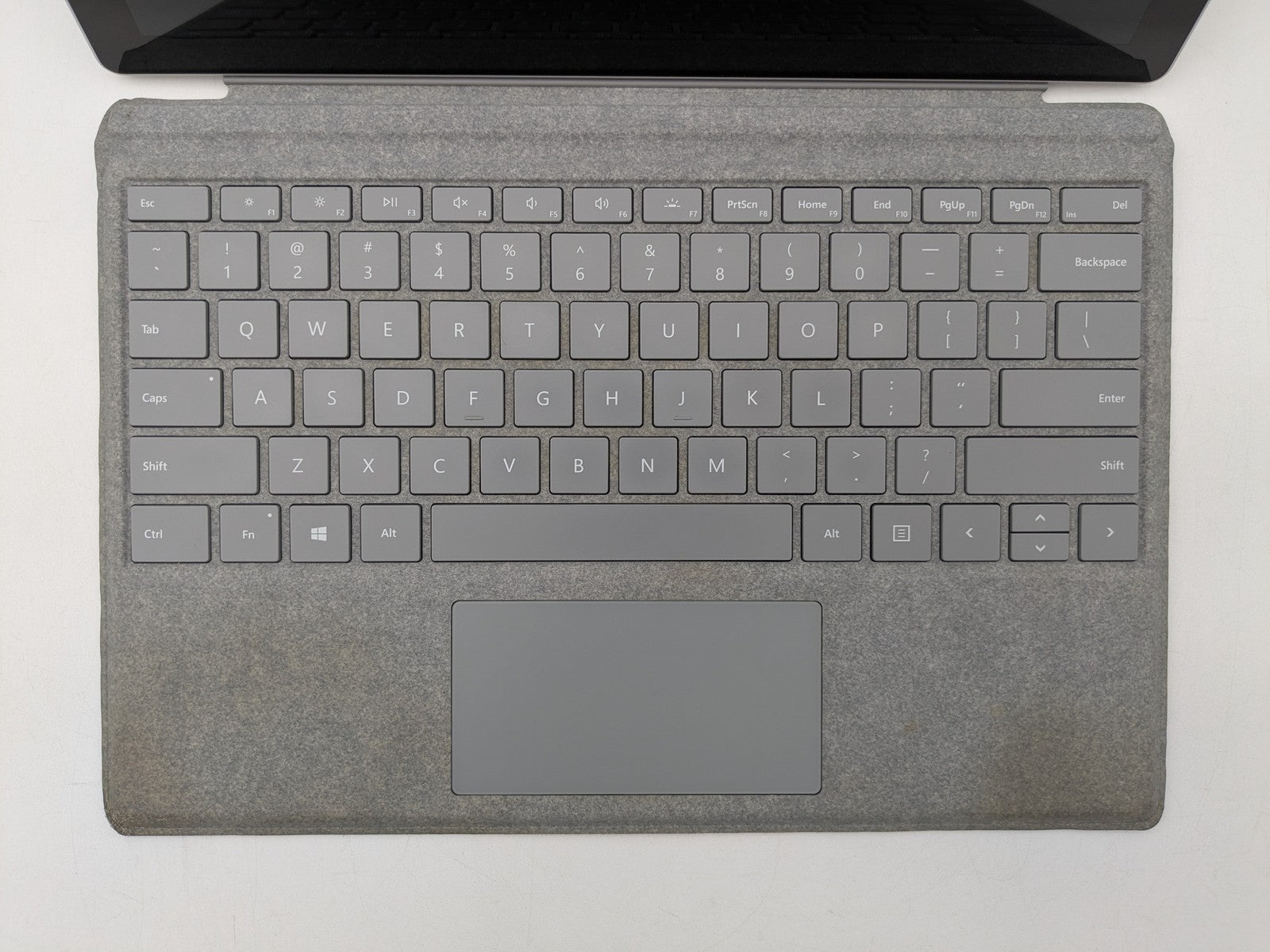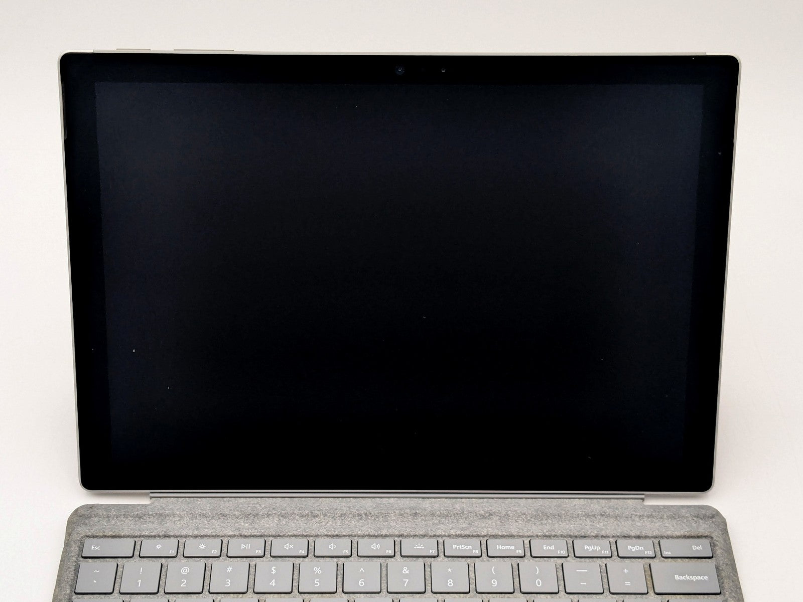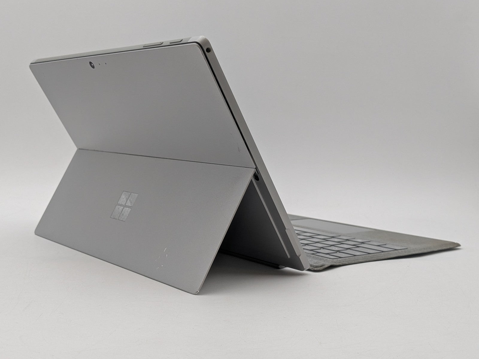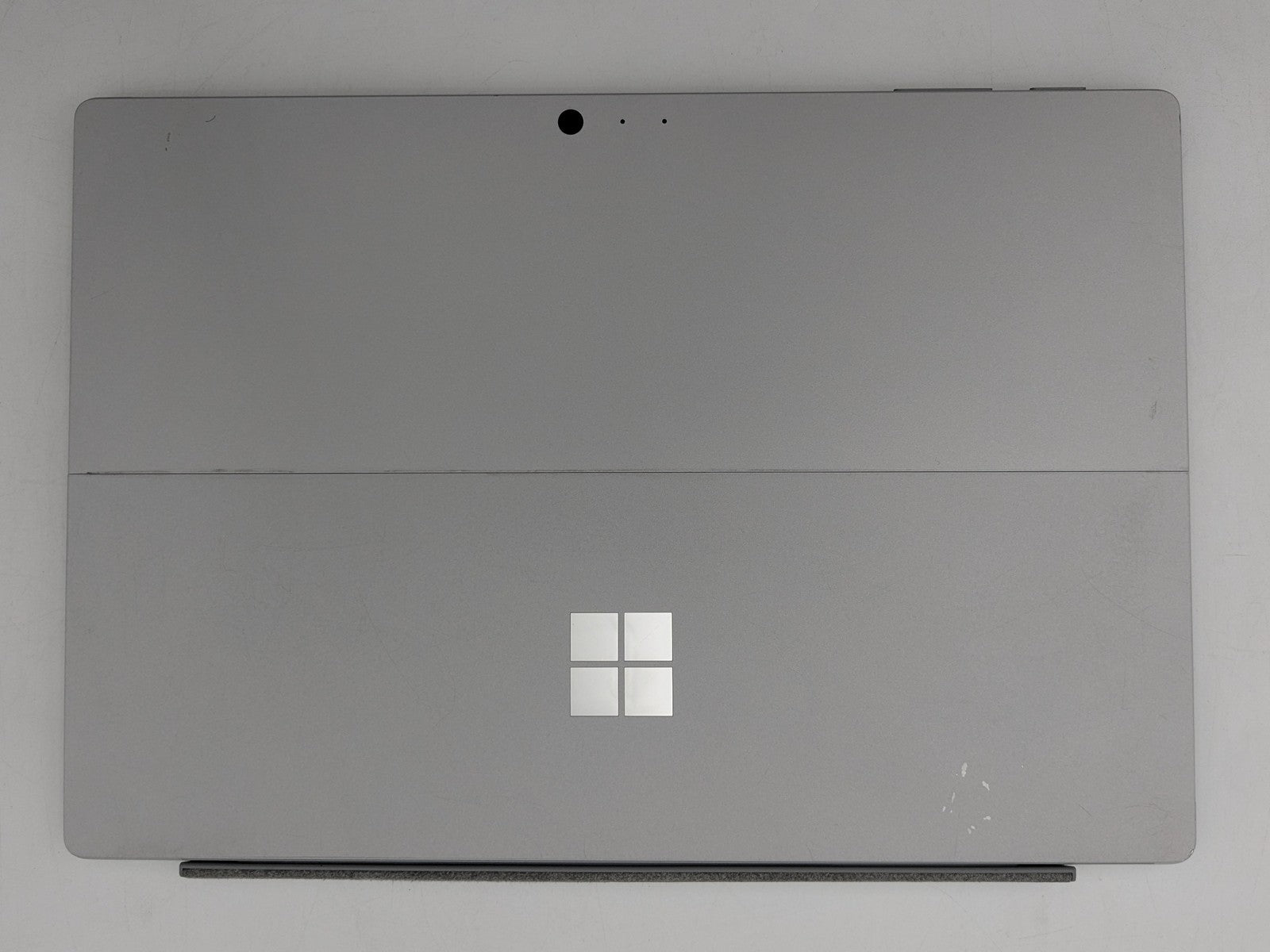 Cosmetic Defects: Tablet: Display has visible keyboard imprinting. Backlight bright spots. Keyboard connector has friction wear. Back cover and kickstand have mismatched screw, small paint chips, visible scuffs, and scratches. Keyboard: Keycaps have heavy wear. Cloth surfaces have staining and wear on edges.