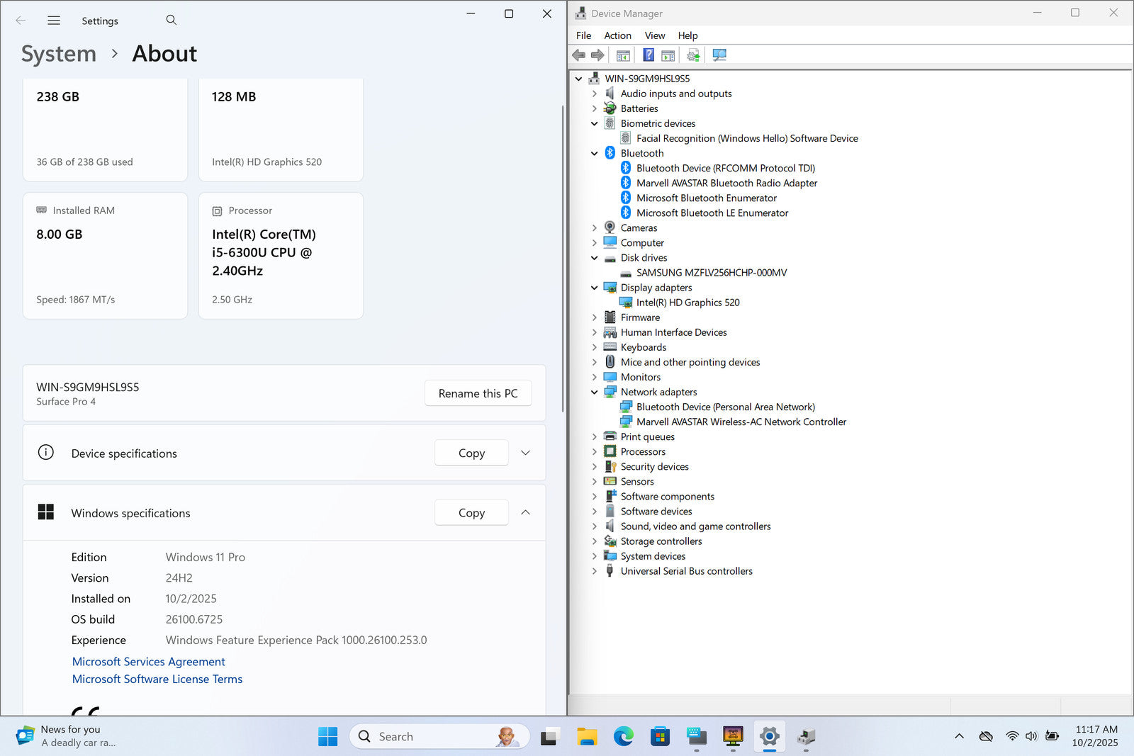 Surface Pro 4 2-in-1 12" 2736 x 1824 Touch I5-6300U 256GB 8GB W11P Webcam IRCam