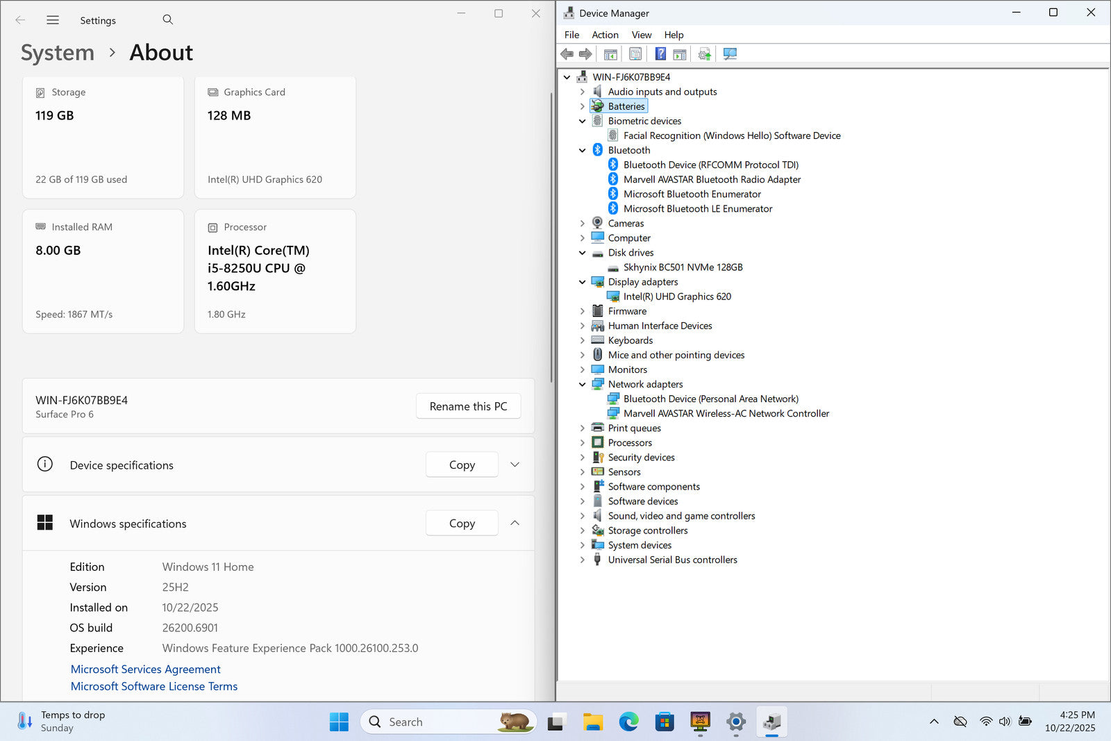 Surface Pro 6 2-in-1 12" 2736 x 1824 Touch I5-8250U 128GB 8GB W11 Backlit IRCam