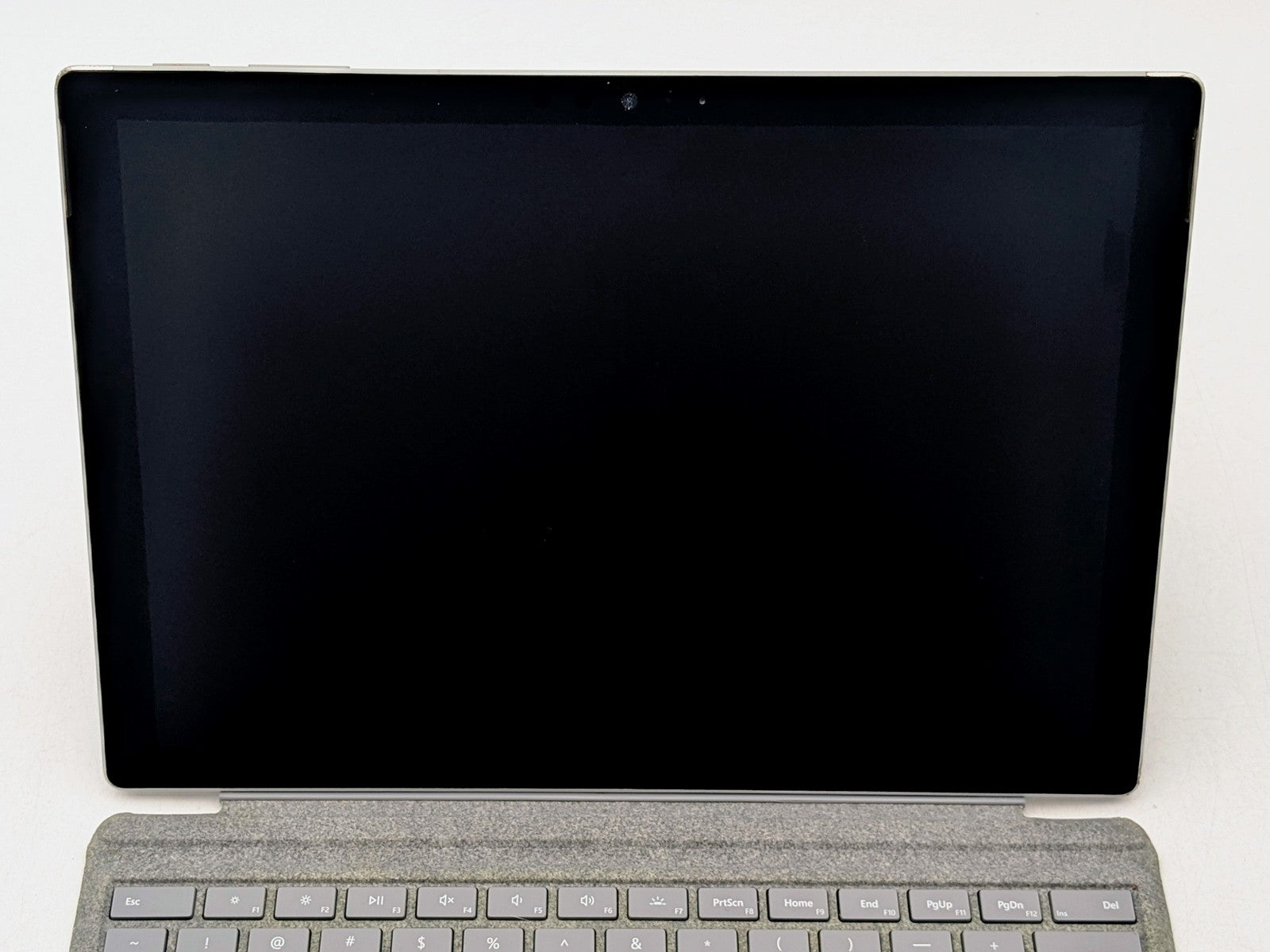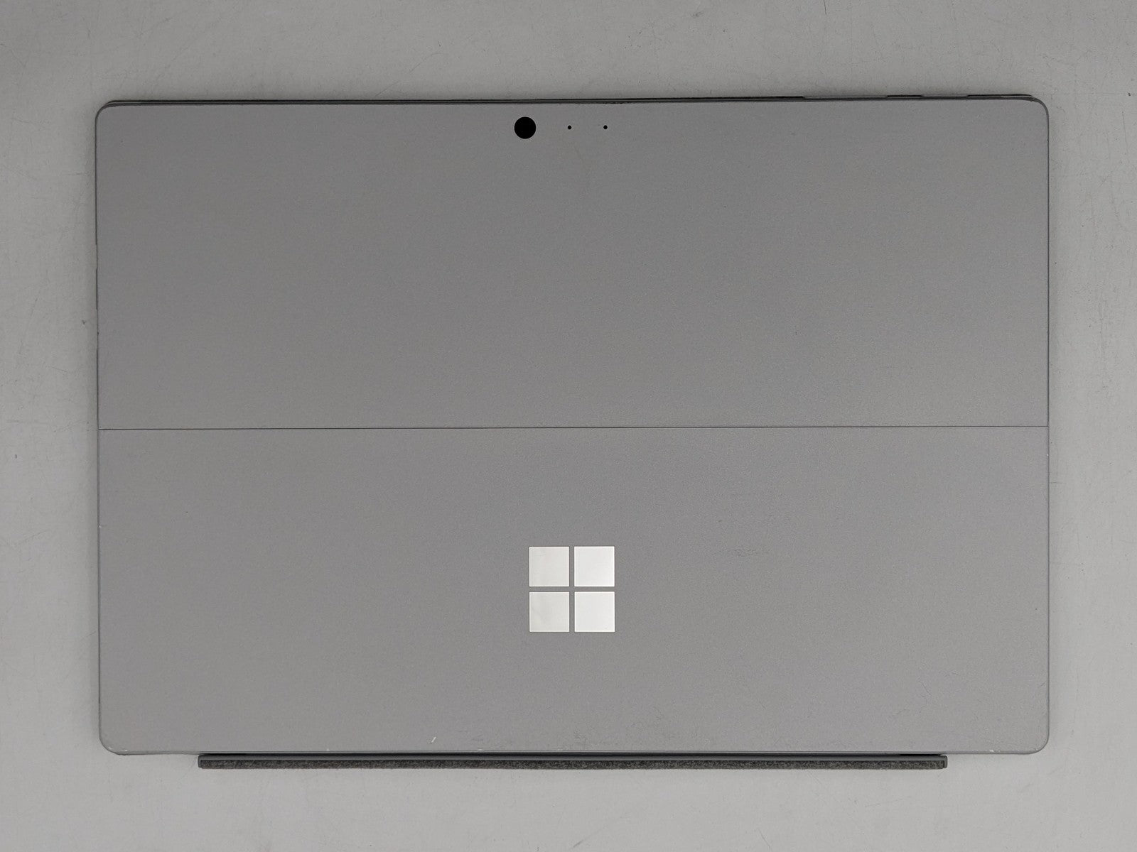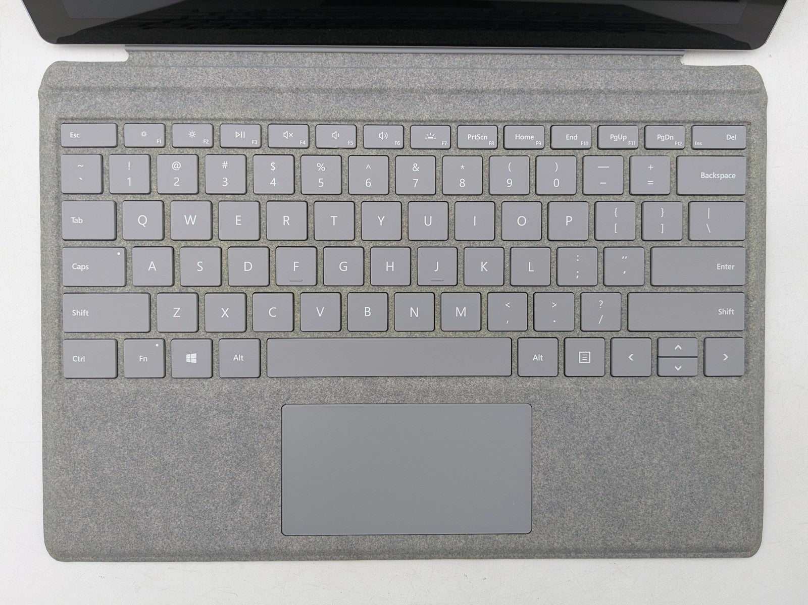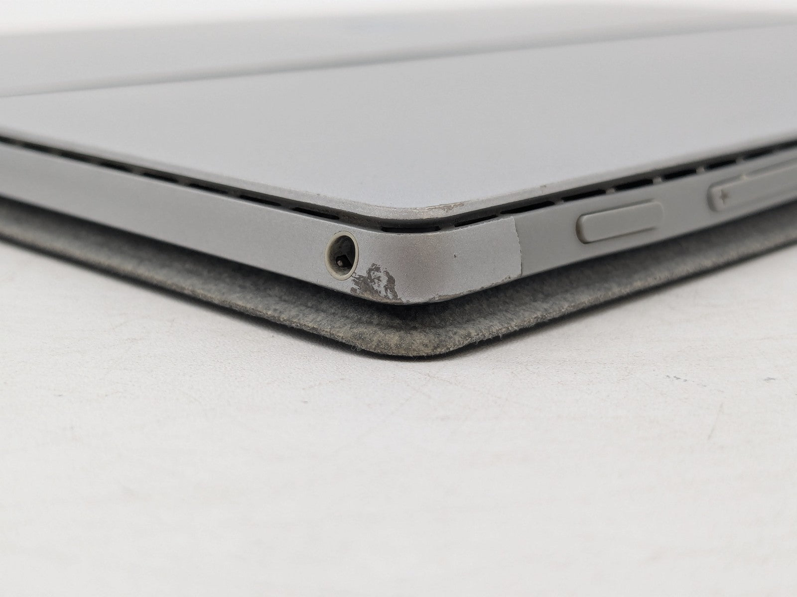 Cosmetic Defects: Interior: Several shallow scuffs and scratches on display, slightly visible during normal use. Light discoloration on fabric keyboard cover. Exterior: Dents and scuffs on corners. Marks and wear near keyboard connector. Wear and stains under stand. Scratches and paint chips on top cover. Patches of discoloration.