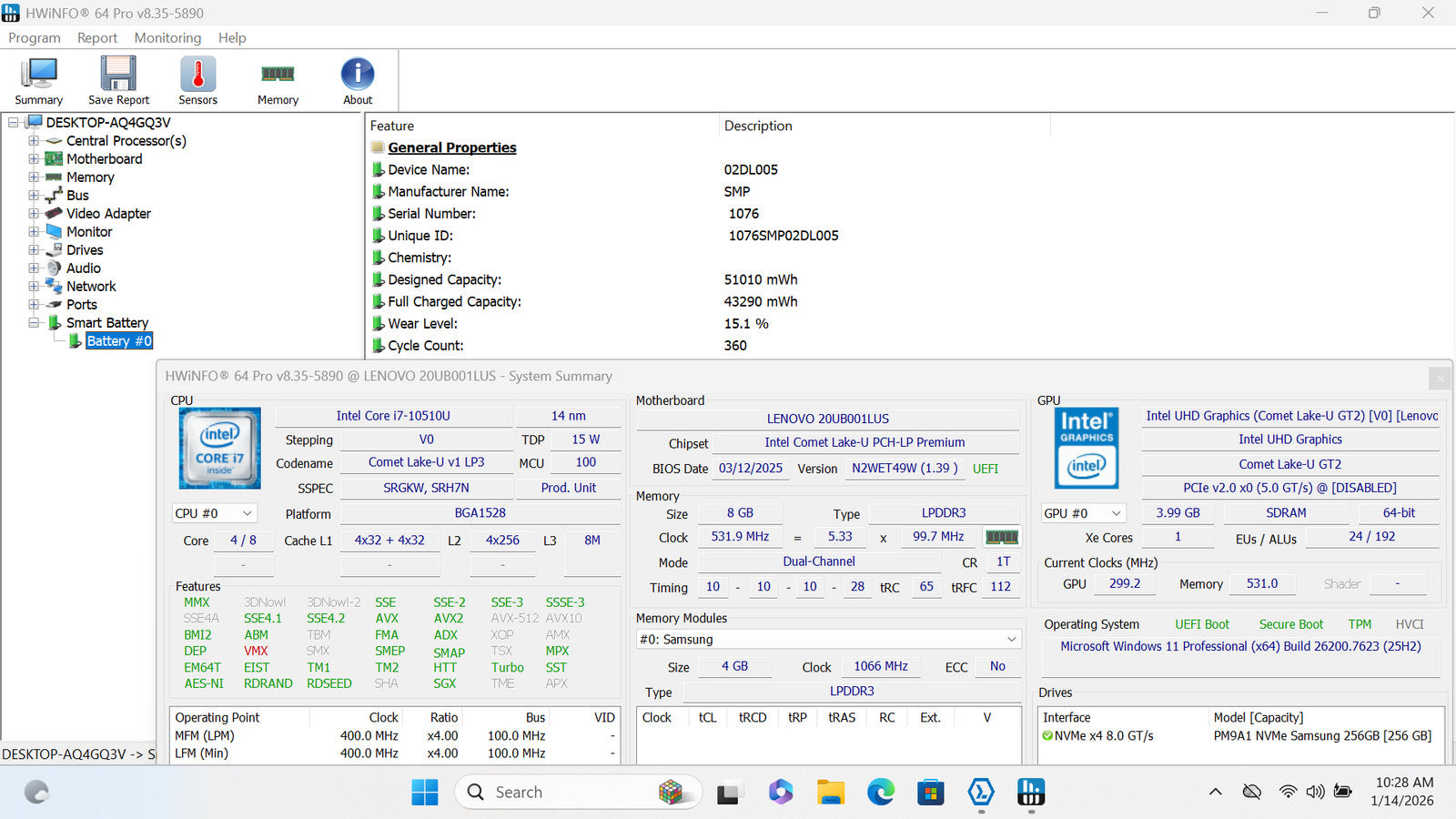 Battery Condition: 43,290/51,010 mWh 84.87%